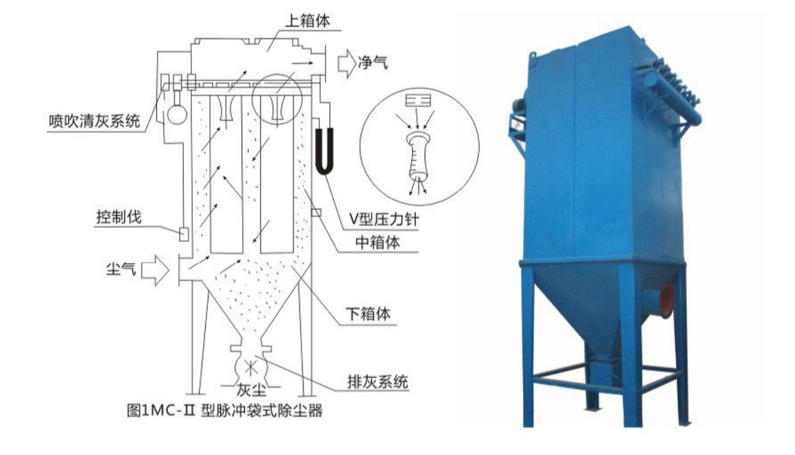 含尘气体由进气口进入灰斗或通过敞开法兰口进入滤袋室,含尘气体透过布袋过滤为净气进入净气室,再经净气室排气口,由风机排走。粉尘积附在滤袋的外表面,且不断增加,使袋除尘器的阻力不断上升,为使设备阻力不超120OPa,布袋除尘器能继续工作,需定期清除滤袋上的粉尘。清灰是由程序控制器定时顺序起动脉冲阀,使包内压缩空气( 0.5~0.7MPa )由喷吹管孔眼喷出(称一次风)通过文氏管诱导数倍于一次风的周围空气(称二次风)进入滤袋在瞬间急剧膨胀,并伴随气流的反向作用抖落粉尘,达到清灰的目的。